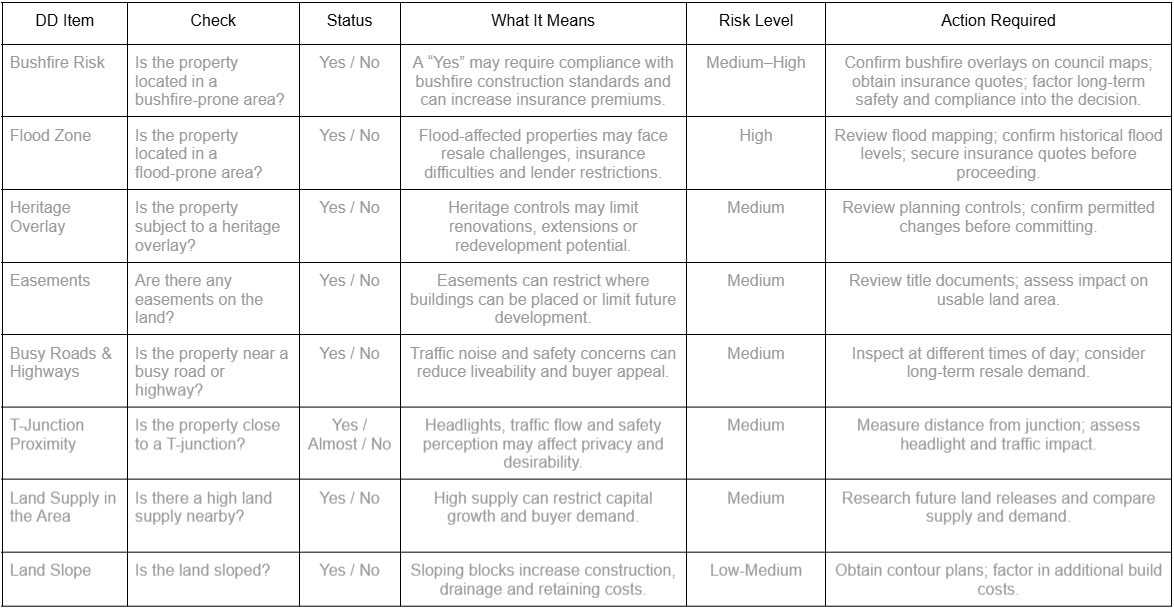 A structured due diligence checklist helps remove emotion from property decisions. By systematically reviewing flood risk, bushfire exposure land characteristics, location factors and legal constraints, you protect both your investment and peace of mind.